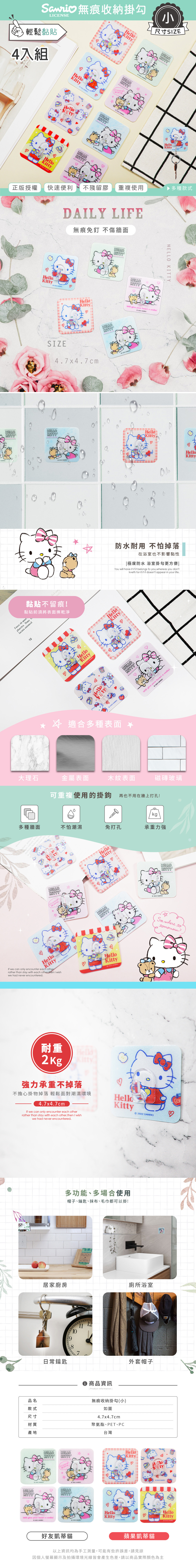三麗鷗 HELLO KITTY 凱蒂-無痕掛勾4入組(小) 收納掛勾【收納王妃】