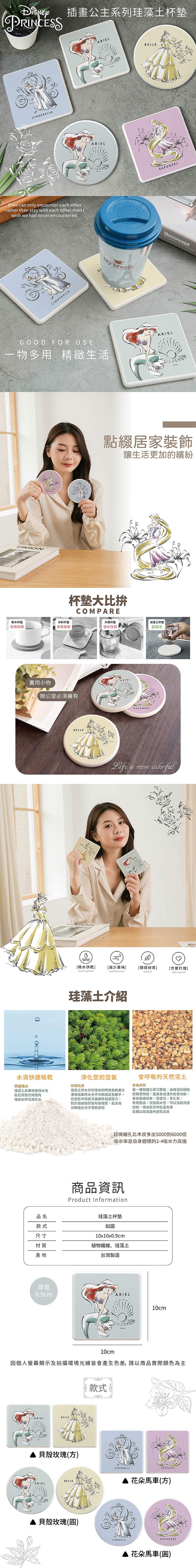 迪士尼公主系列-插畫珪藻土杯墊2入組 | 防滑墊 吸水杯墊 【收納王妃】